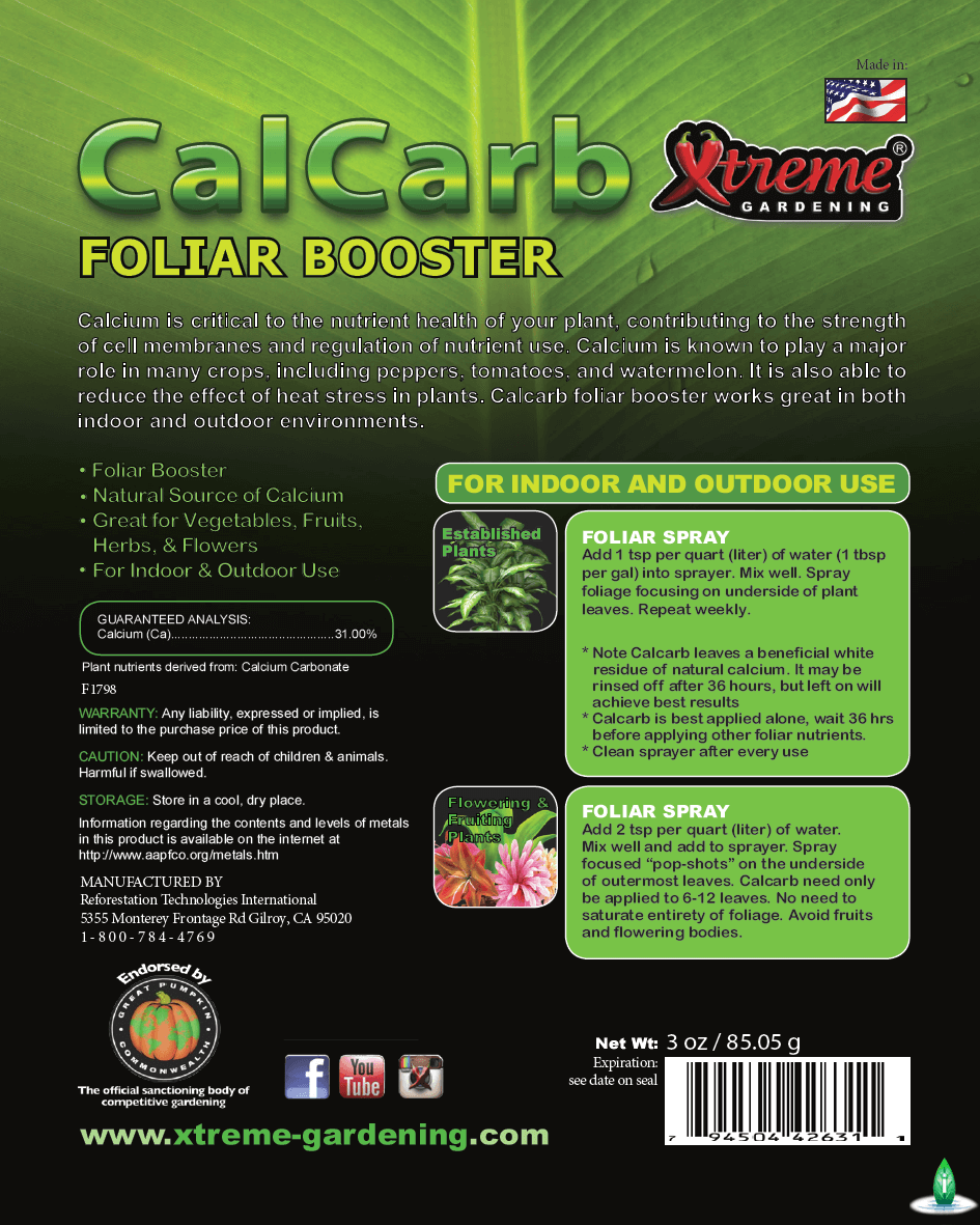 - Piante in fase di fioritura: Aggiungere 2 cucchiaini per litro (litro) di acqua. Mescolare bene e aggiungere allo spruzzatore. Spray “pop-shot” focalizzati sul lato inferiore delle foglie più esterne. Il calcarb deve essere applicato solo a 6-12 foglie.